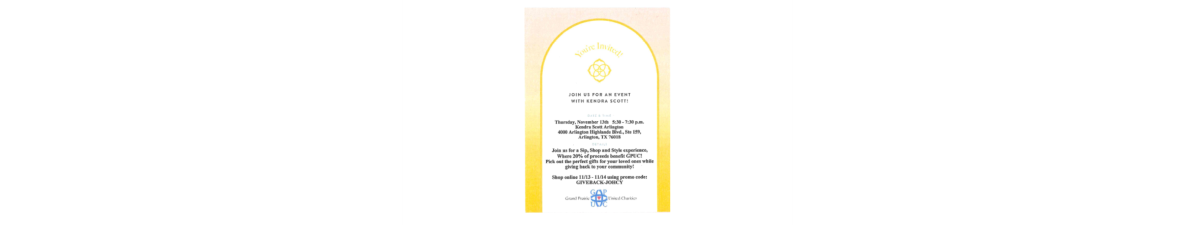 Join Grand Prairie for a Sip, Shop, and Style experience, where 20% of proceeds benefit GPUC! Pick out the perfect gifts for your loved ones while giving back to your community! Shop online 11/13 - 11/14 using promo code: GIVEBACK-JOHCY